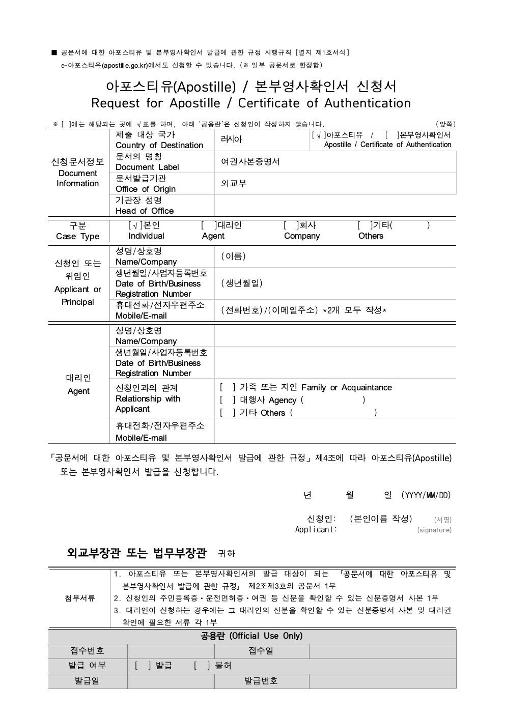- 아포스티유 신청서 및 개인정보 동의서 (아래에 첨부 예정, 미성년자의 경우 개인정보 동의서는 법정대리인 성함으로 서명)